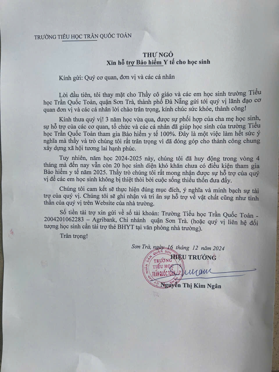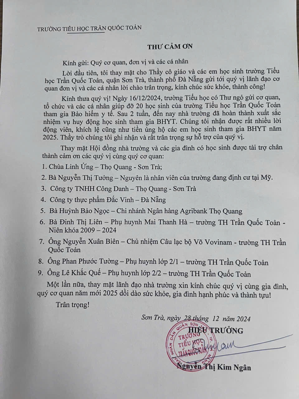 Kính thưa quý vị! Ngày 16/12/2024, trường Tiểu học có Thư ngỏ gửi cơ quan, tổ chức và các cá nhân giúp đỡ 20 học sinh của trường Tiểu học Trần Quốc Toản tham gia Bảo hiểm y tế. Sau 2 tuần, đến nay nhà trường đã hoàn thành xuất sắc nhiệm vụ huy động học sinh tham gia BHYT. Chúng tôi nhận được rất nhiều lời động viên, khích lệ cũng như tiền ủng hộ các em học sinh tham gia BHYT năm 2025. Thầy trò chúng tôi ghi nhận và rất trân trọng sự hỗ trợ của quý vị.
